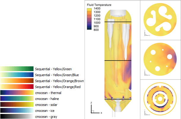 Sequential colormaps are ideal for scalar values in which there’s a continuous range of values. Think pressure, temperature, and velocity magnitude. Here we’re using the ‘cmocean – thermal’ colormap in Tecplot 360 to represent fluid temperature in a Barracuda Virtual Reactor simulation of a cyclone separator.